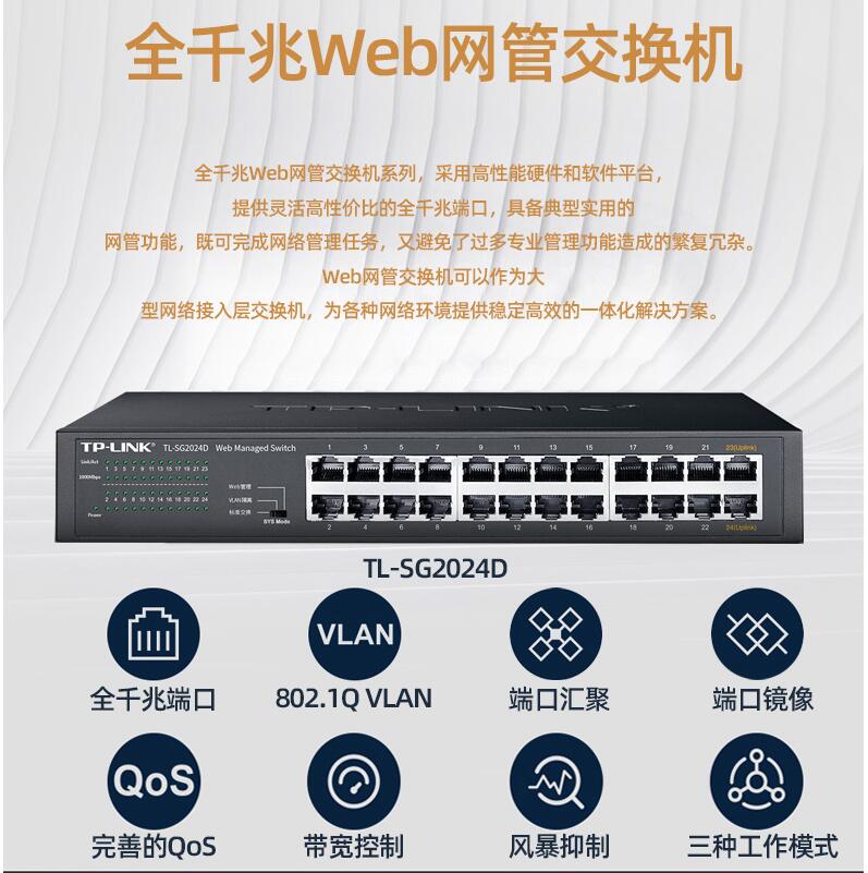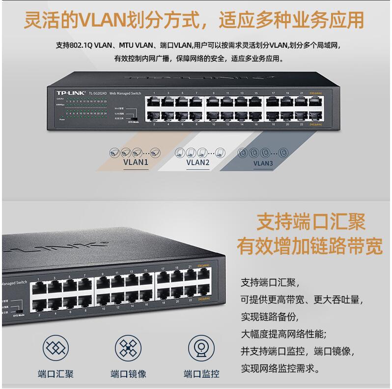 tplink24口千兆交換機(jī)16口48口百兆監(jiān)控專用網(wǎng)絡(luò)無(wú)線網(wǎng)線分流轉(zhuǎn)換交換器以太網(wǎng)企業(yè)web網(wǎng)管級(jí)VLAN匯聚SG2024D